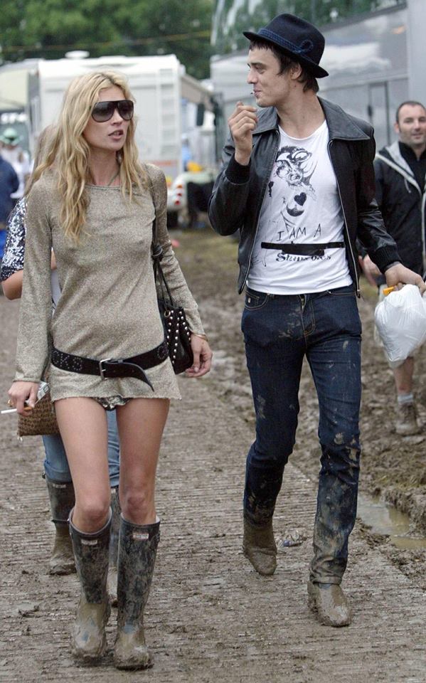 stivali di gomma sporchi di fango e shorts, abbracciata a Pete Doherty, il
